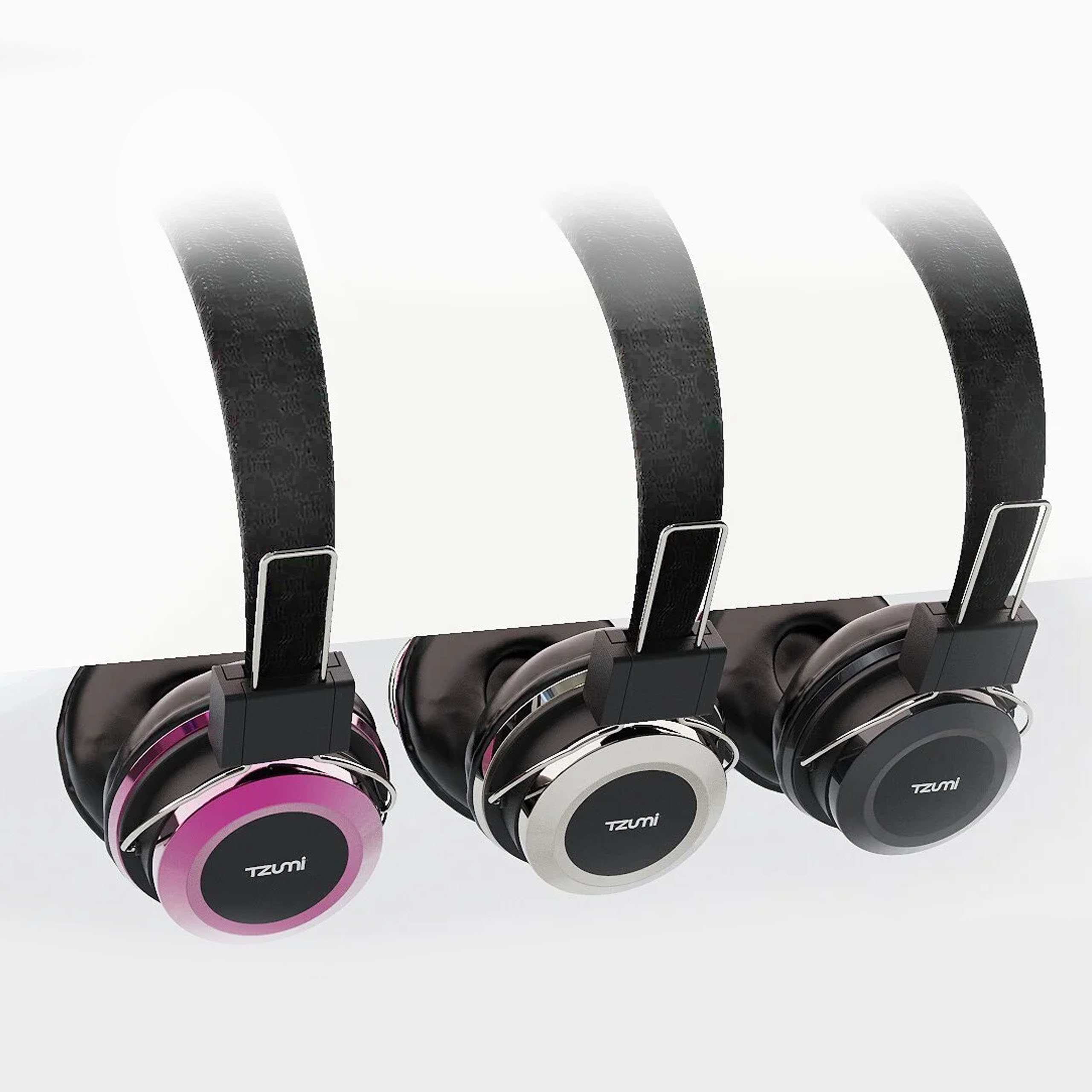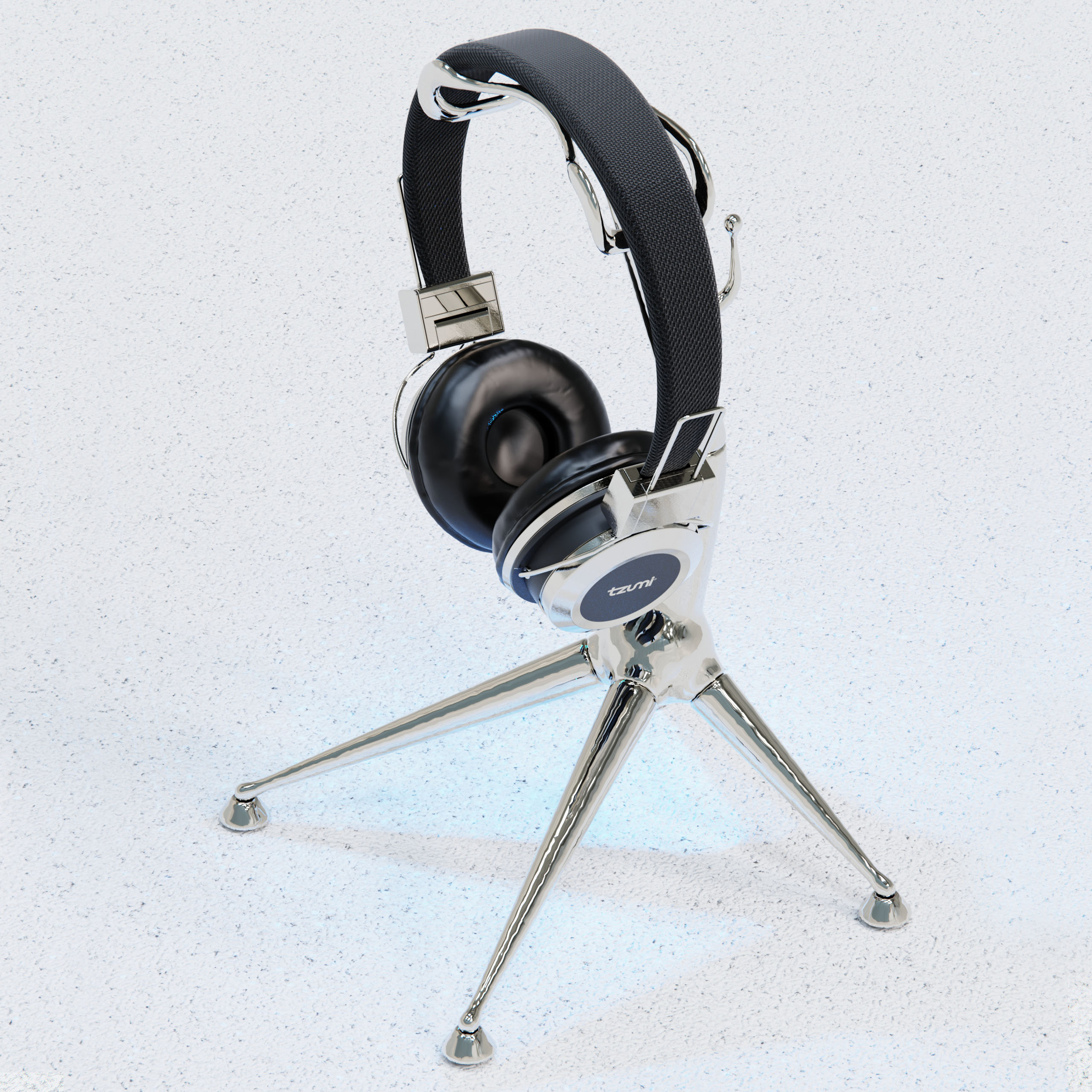 The final design merged the sterling chrome headphone stand with Tzumi’s headphone line, which launched in blue, pink, black, and chrome. By pairing the chrome stand with the chrome headphone variant, I leaned into a “shiny objects attract attention” theory, using reflective appeal to capture consumer interest. This visual emphasis on chrome not only elevated the stand as a premium accessory but also created a halo effect for the other colorways through association. The result was a cohesive product presentation where the stand doubled as both a functional support and a marketing tool, helping to drive sales across the full headphone line.